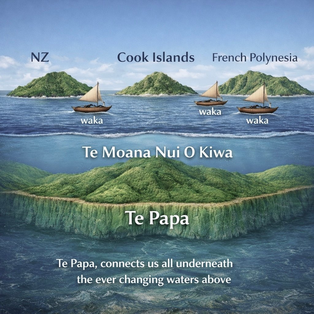 Across the islands of Pacifica, our ancestors voyaged by stars and sea currents, carrying stories, values, and ways of living in harmony with nature, in unity with one another. Separated by ocean, yet forever connected beneath the everchanging waters of Te Moana Nui no Kiwa (our ocean), bound together through the living body of our Earth (Te Papa).